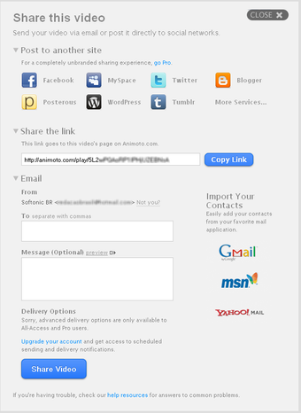 O resultado é surpreendente e até parece feito por um profissional. Depois, você pode compartilhar o vídeo por email ou em redes sociais como o Facebook e o Orkut ou escolher alguma outra da enorme lista disponível. Se preferir também pode publicar o vídeo do Animoto diretamente no seu blog ou website, e ainda subir para o YouTube.
